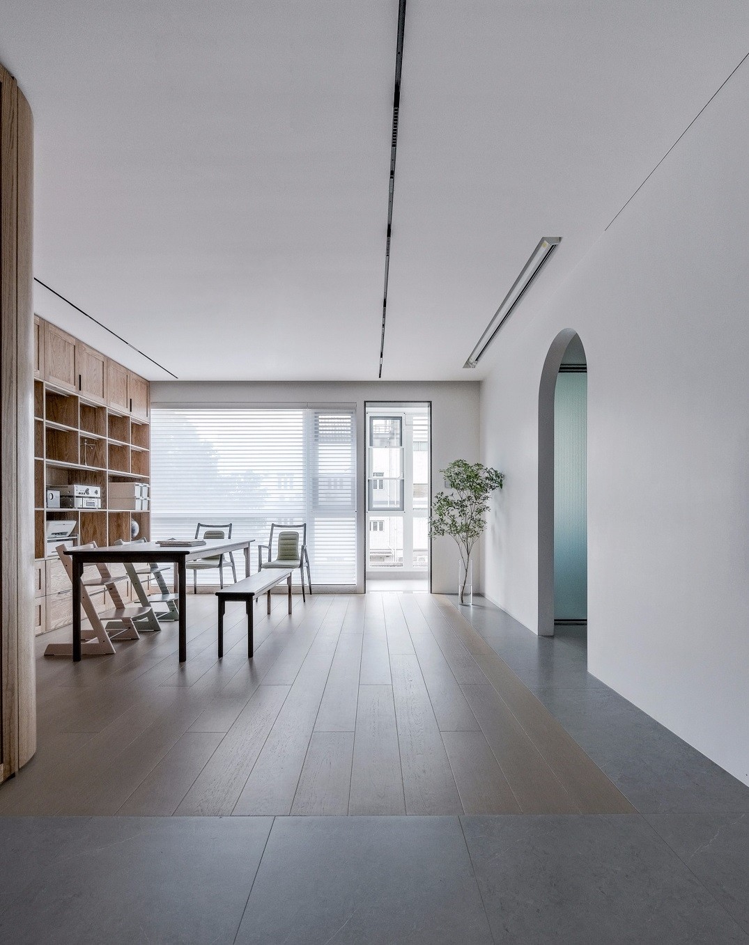 木地板与地砖的完美结合,好像是在给空间分区,一侧墙上安装投影幕布,块面组合的形式十分***,设计将雅致生活与现代艺术结合,并借由开放的布局、灵活的动线,共同构建整个空间简洁又极具质感的视觉印象。