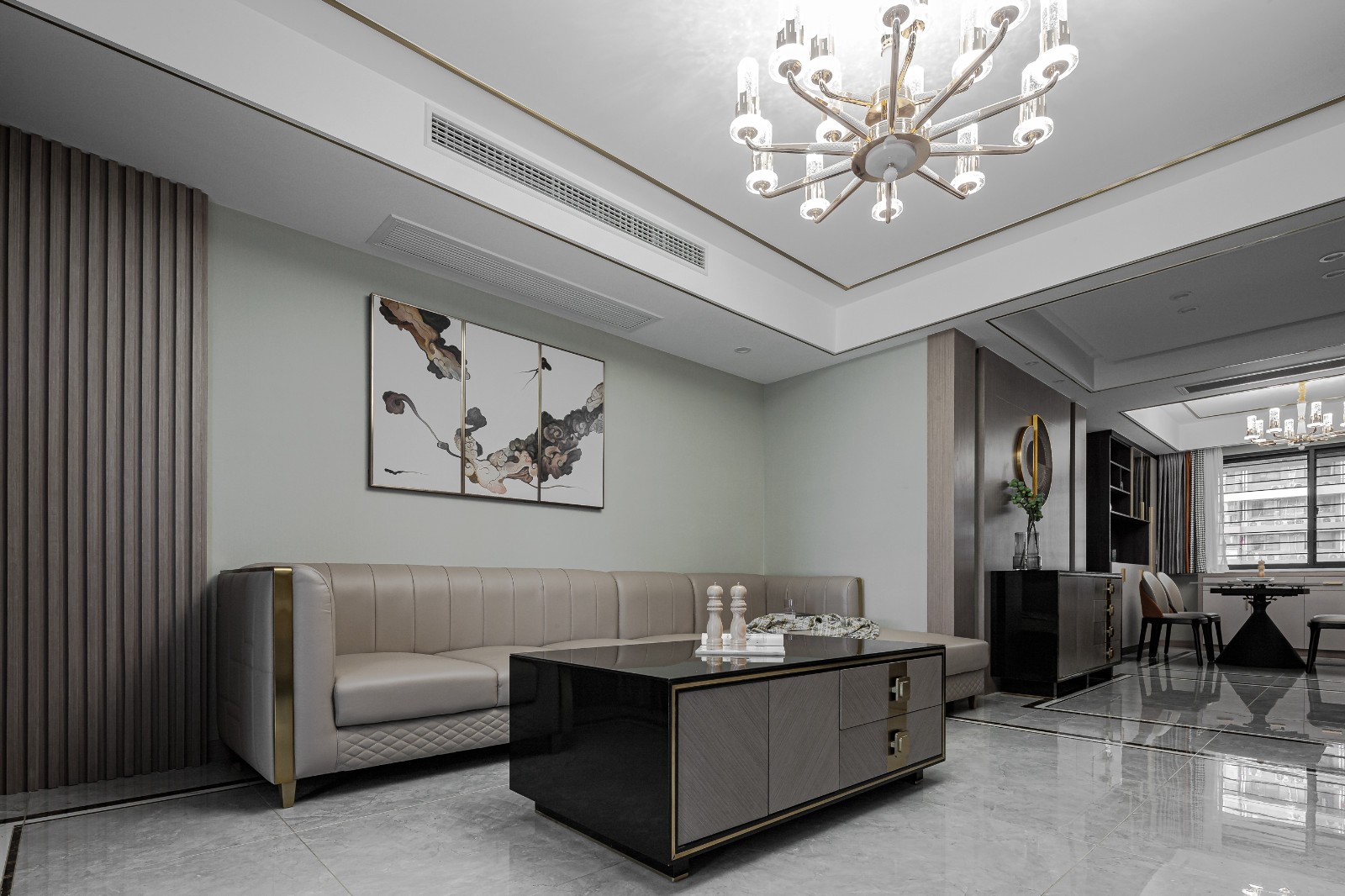 茶几与电视机柜同样是定制的,黑色台面+木饰面两色,轻奢大方。屋主特意选了容量大的款式,作为客厅的收纳补充,毕竟是家有两宝啊!