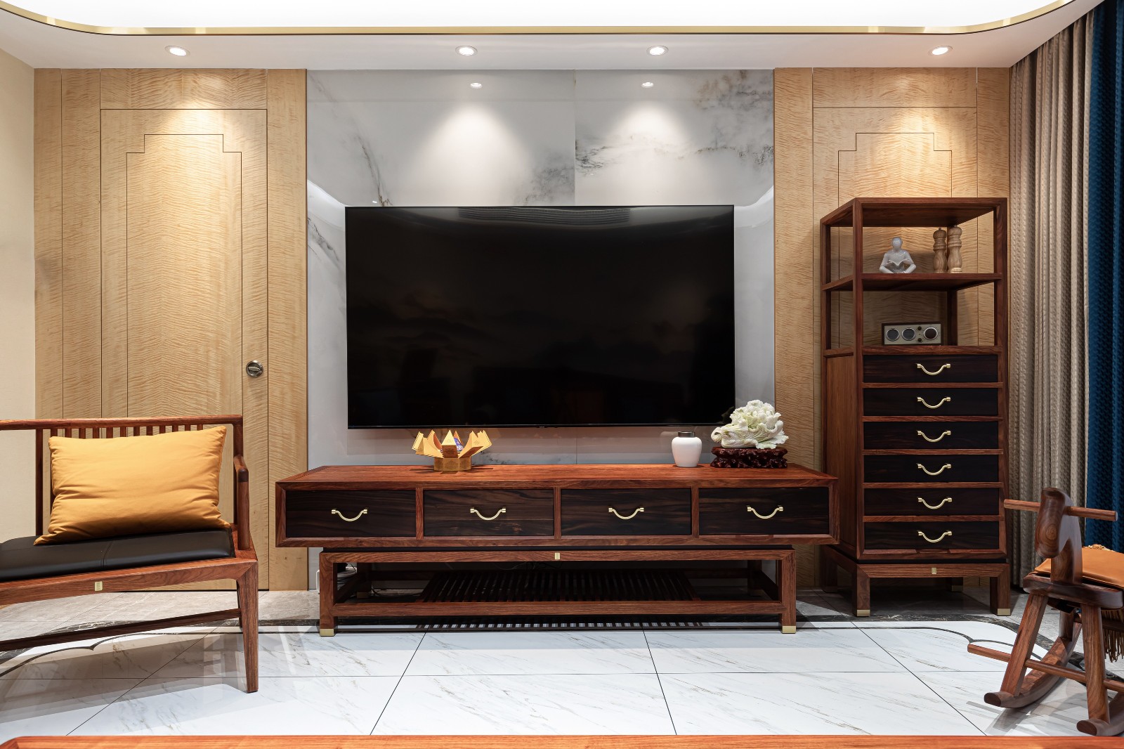 电视背景墙采用水墨晕染的大理石上墙,一侧嵌入同色系隐形门,另一侧对称嵌入实木背景板,形成冷暖对比,加强整体统一性。