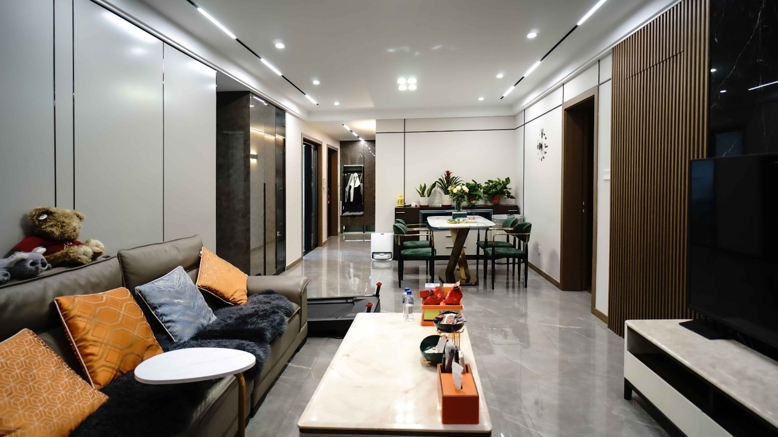 客厅采用无主灯设计,让客厅空间不仅只是照亮而已,更有了氛围和层次感,电视背景墙大理石结合木格栅衔接次卧门做隐形门,增大电视背景墙使电视背景墙更大气不再单一.整个客餐厅空间以灰色调为主。