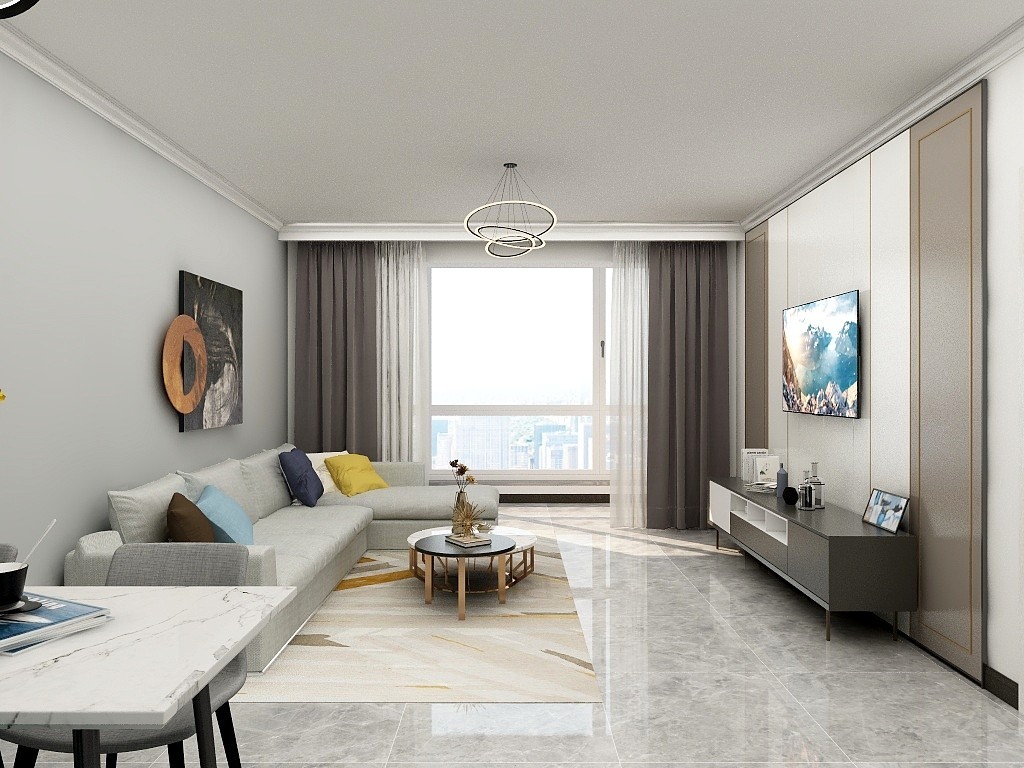 户型为二居室,南北通透,风格现代简约,墙面用白色和灰色搭配,使空间更干净通透。