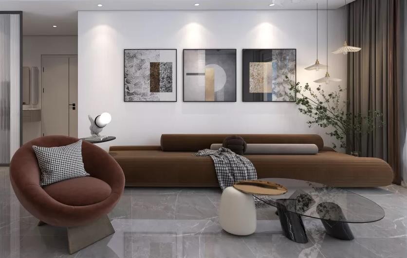 客厅沙发不是中规中矩的设计方式,带有艺术感,配合台灯和吊灯和筒灯的设计,层次感十足。