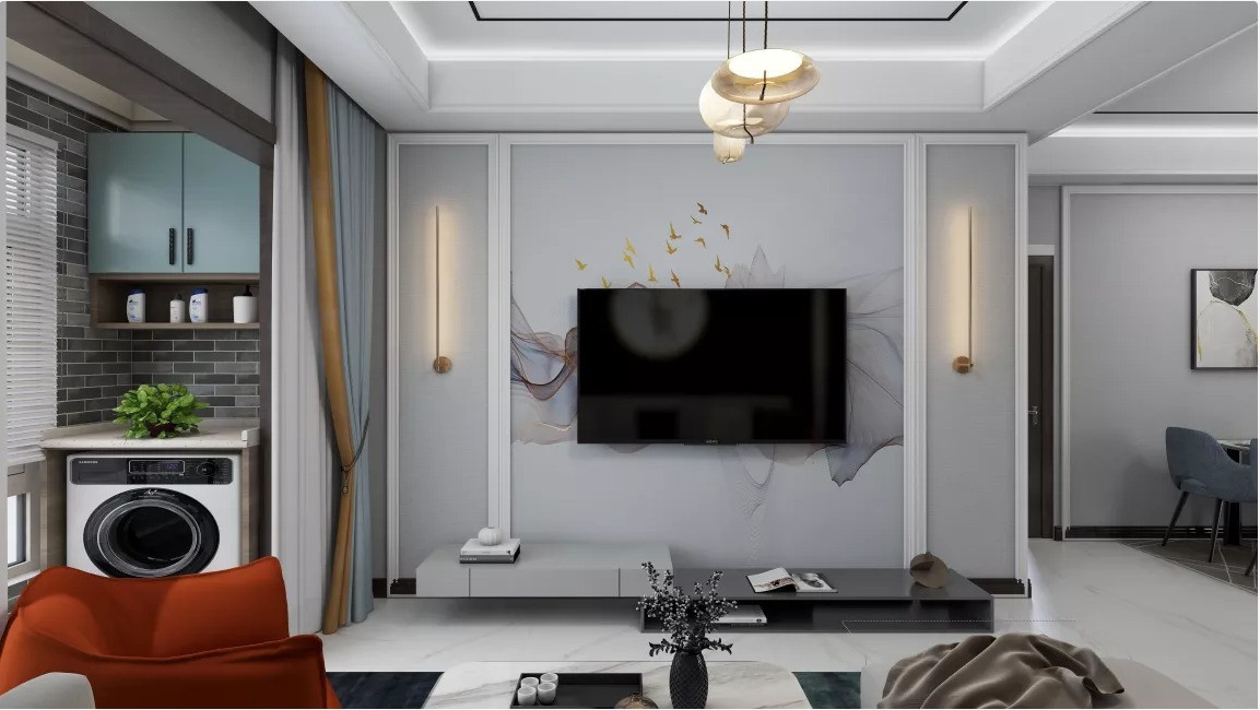 电视背景墙采用墙布和石膏线条相结合,生活阳台搭配了滚筒洗衣机,晾晒方便