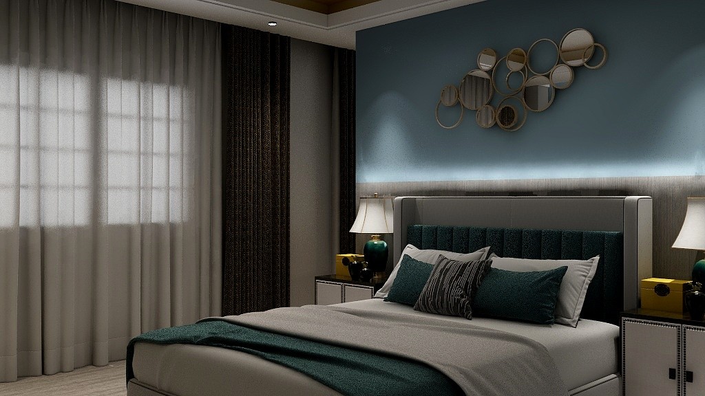 卧室采用半开放式,整体风格配色偏地中海风格,地面铺地毯。