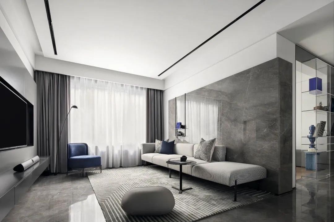 电视墙以灰色的定制墙板,装上一个深灰色的悬空电视柜,窗边布置一张蓝色的休闲沙发椅,无主灯的天花上加入两道黑色的嵌入式灯带,也增添了空间的极简与安静舒适感。电视墙的电视柜延伸到餐厅区域,做成很长很实用的设计,而电视墙中间区域的黑色空格也是延伸出来,加入隔板架,摆上黑白配与蓝色的装饰画,还有精致的小饰品,带来一个简洁优雅的***空间感。