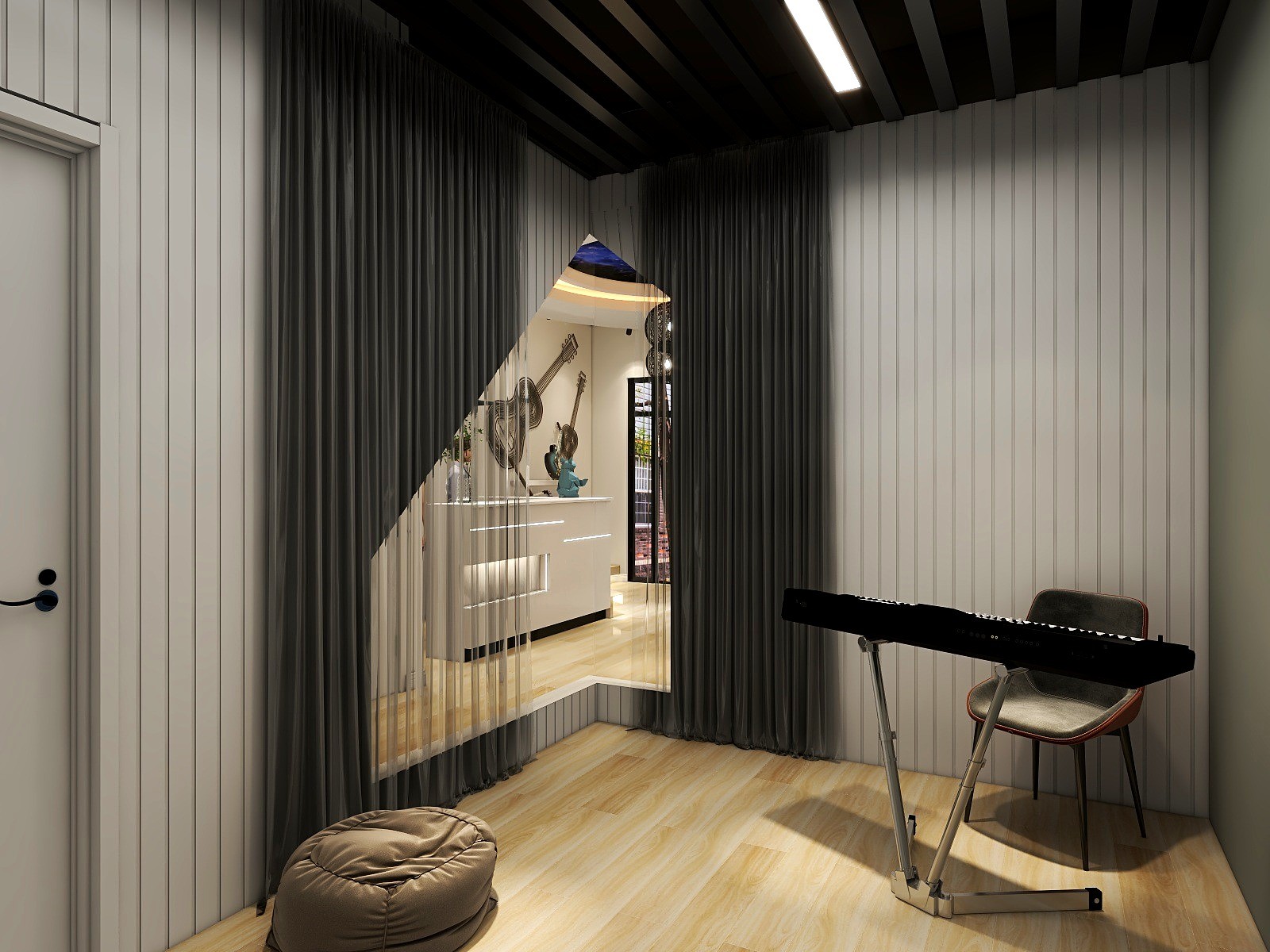 业主这里呢是最多一对三的模式,教学比较专一,所以房间呢也不是很大的那种,墙面采用了吸音板墙体也是用的双面石膏板做的隔墙里面也加了隔音棉双重隔音效果刚刚滴,造型窗采用了若隐若现的黑色纱布如业主想来看忘孩子呢也是可以看一下又不会影响到孩子学习就很奈斯。