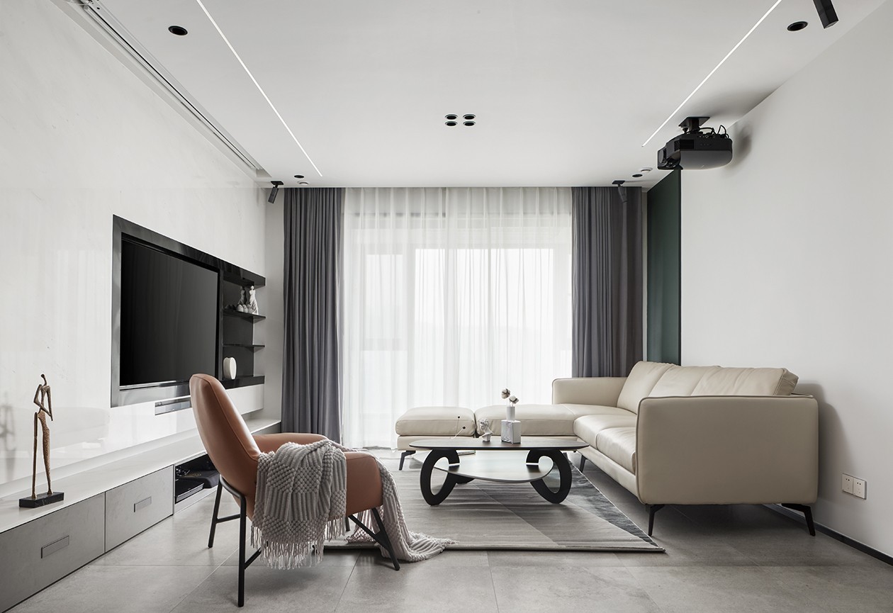 客厅以黑白灰为基调,整体空间线条干净利落,体现出现代简约生活的品质感。棉麻、皮质,木饰面等材质融合在一起,让空间协调又富有层次。