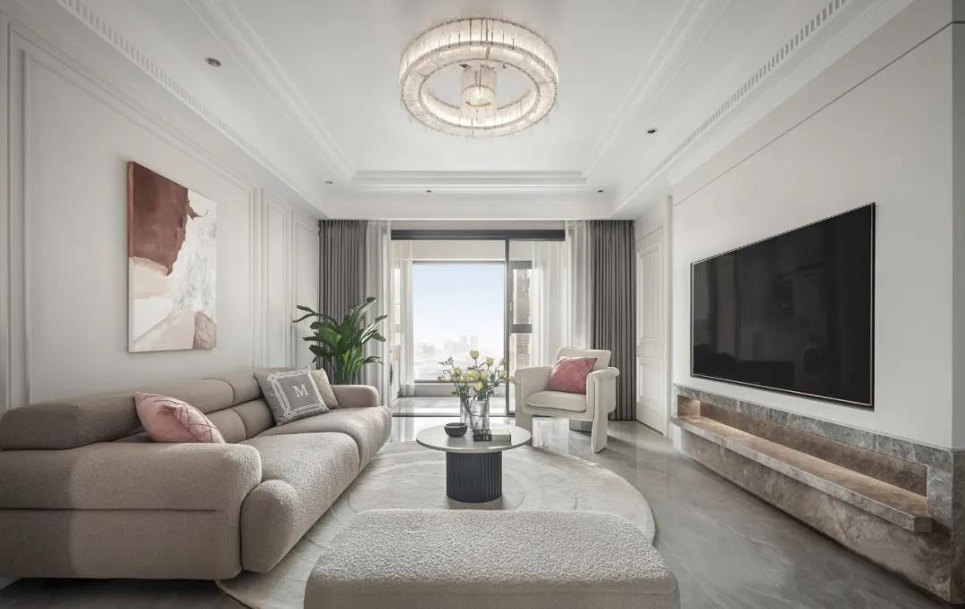 客厅,灰色地砖搭配小法式元素的顶面细节,精致的主灯提升整体颜值