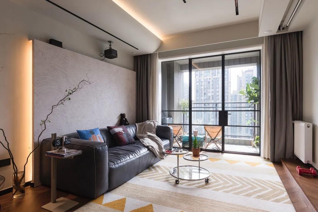 客厅宽松舒适为主,考虑到电视使用频率不高,选择了投影仪来满足日常影音需求,搭配轻巧富有设计感的茶几,满足日常使用需求,又避免了传统客厅布置,带来的空间紧凑感。地板和沙发选择了深色系列,搭配颜色较为鲜亮的地毯,既冲撞又和谐,让空间更有层次感。