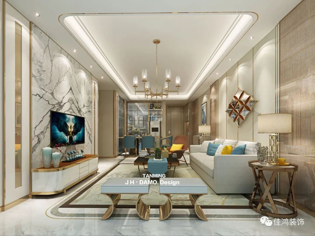 客厅|精致的花纹背景墙与地砖相呼应着,金属线条起着装饰作用的同时,渲染着奢华感,黄蓝的跳跃色为空间带来清新活跃的气息,华美的水晶灯、菱形镜面装饰、灰色硬包沙发,简单利落地叠出层次,让视觉更放松,格调更纯粹。