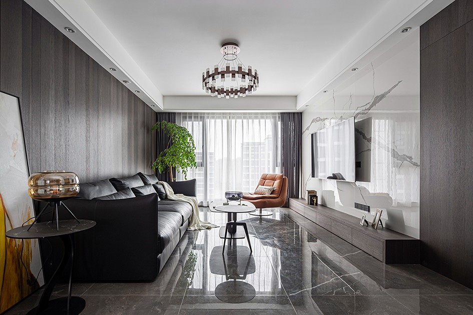 纯色的皮衣和简约造型的茶几让整个空间看起来非常简约好看。