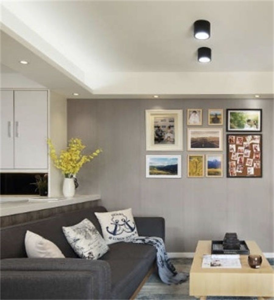 从阳台看过去客厅与餐厅,动线明确,视觉开阔。餐厅对面墙用木饰面装饰,木饰面+乳胶漆的拼接效果让整个客餐厅没有那么沉闷,很好地过渡了入门走廊两面白墙的压迫感。