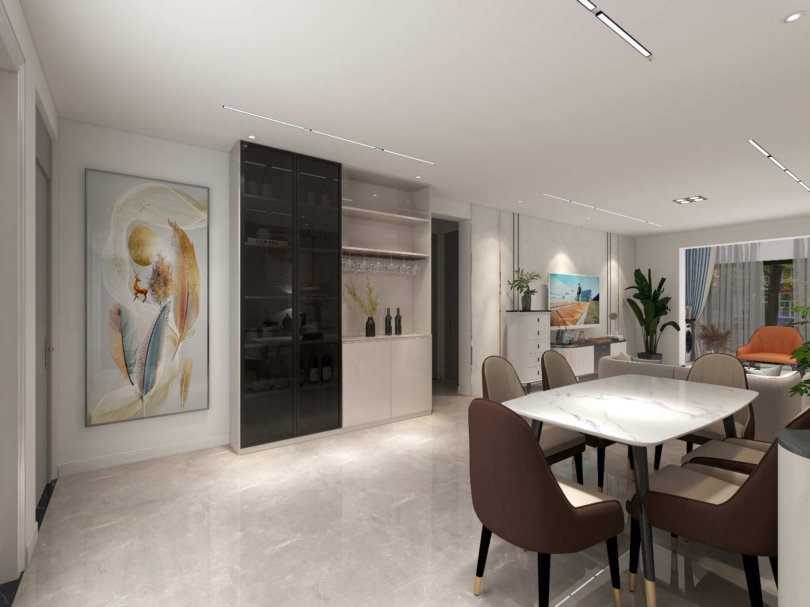 客餐厅无主灯设计,色系以深咖色调为主,搭配暖色,入户玄关搭配黄色画,符合风水聚财的意义,客厅沙发背景做简单造型,使整个客餐厅既简洁又不失造型美,设计师希望既能体现出时尚感,又有家的感觉,使整个客餐厅既亲切又舒适,再搭配精致的家具。