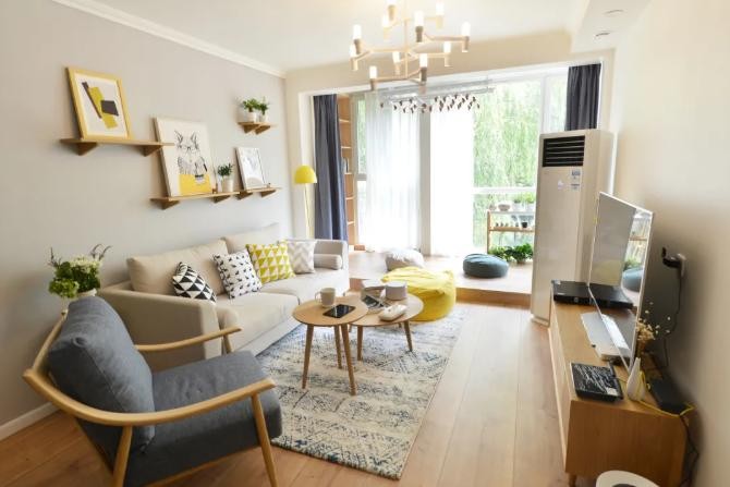 在这套70平米的小户型中,整体以简约风格的装修设计基调,在简洁的空间中布置上原木质感的家具,并布置上布艺质感的家具,加入舒适鲜艳而活力的色彩软装装饰,为我们带来一种自然舒适的空间。