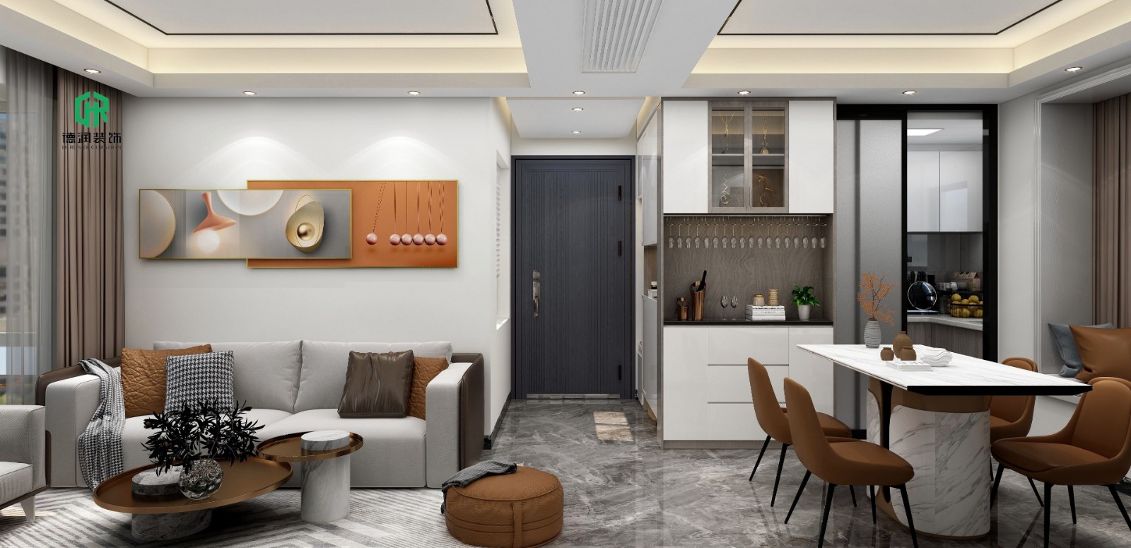 客餐厅吊顶中间吊平顶、藏风管机、走边吊顶暗藏灯带、一方面为了美观、二是为了遮蔽原始房屋的消防管道