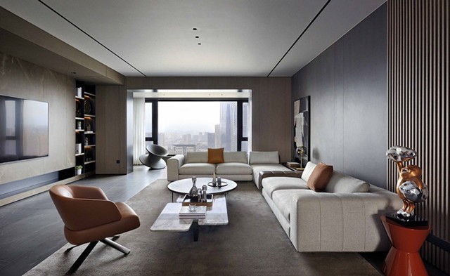 富有情感且温润的木质材料 给深灰色基调的空间升温、柔化,引入大自然的元素,让家更富有情感。