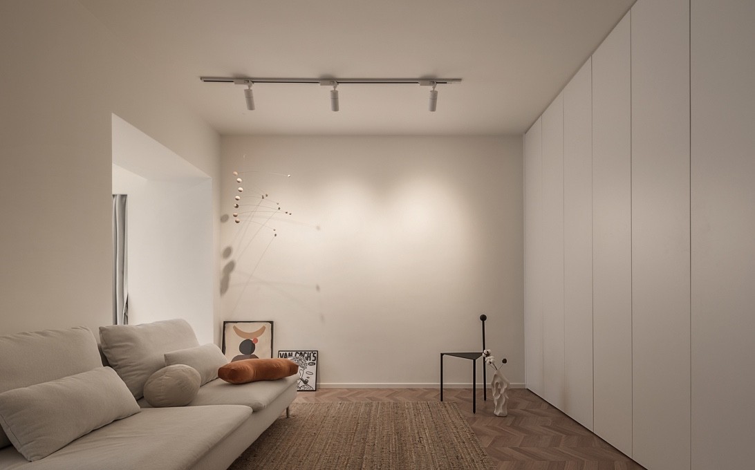 从岛台看过去客厅,右侧一整面大衣柜满足了日常2人的储物,没有太多的家具显得空间干净空旷