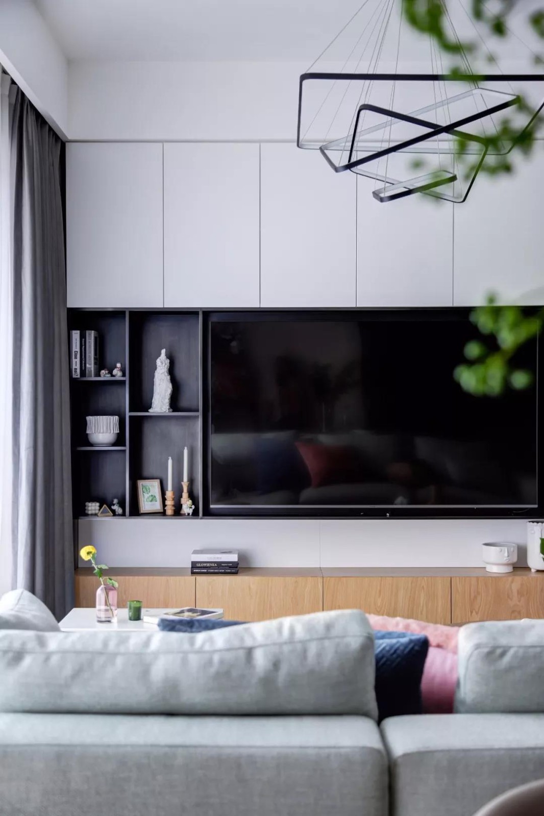 电视墙以定制柜作为主体,左侧加入了几个黑色的开放格架,摆上雅致的装饰品,让空间显得现代优雅而大气。