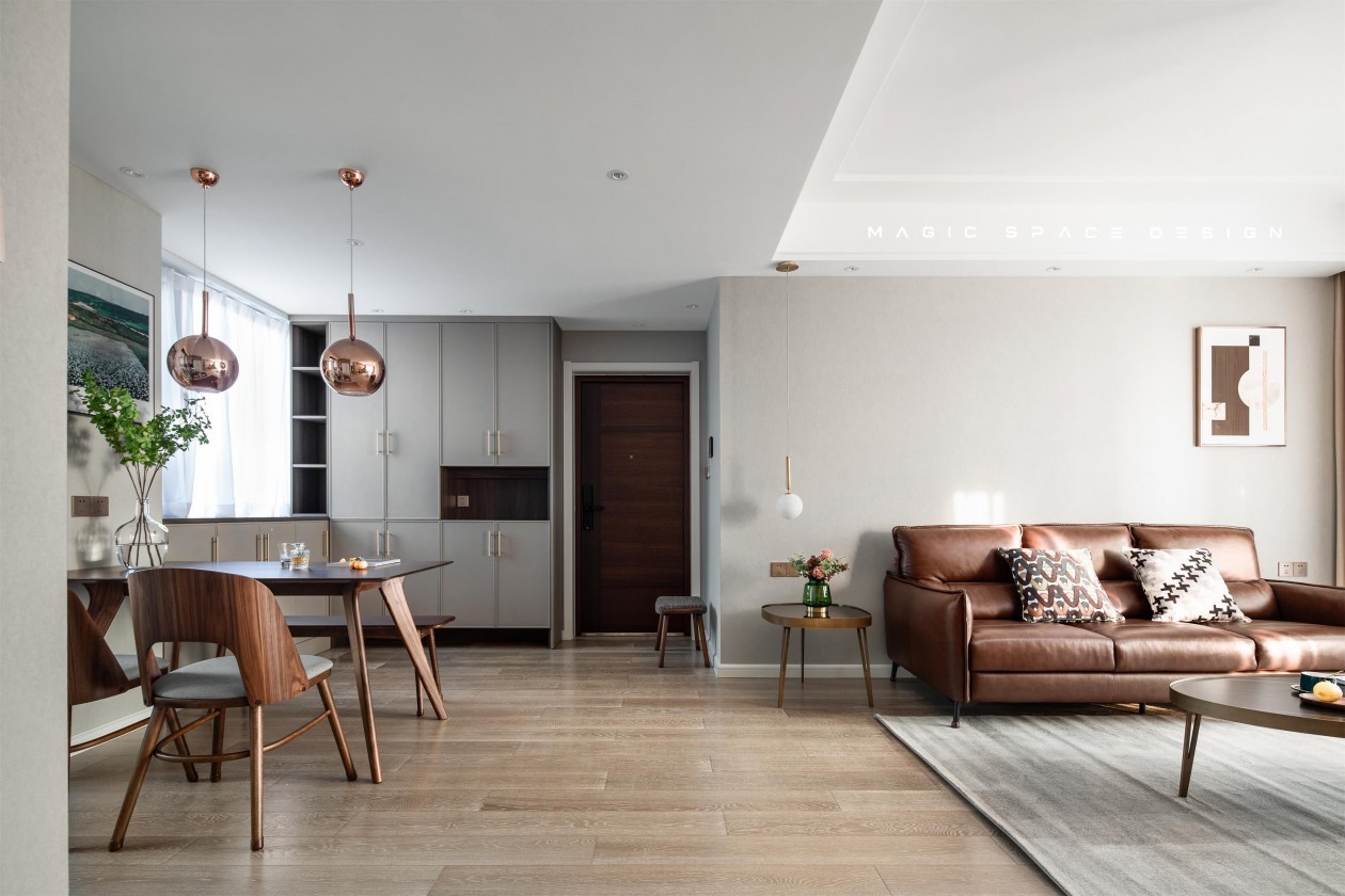 良好的采光有益于让入局者感受空间的贯通,设计师有意强化区域的结构和色彩,通过一组金属色的吊灯恰到好处的将虚实关系勾勒出来。 因为厨房格局较小,所以体积庞大的双开门冰箱被安置在外部的定制柜内,平日里在客厅休息时取用放置也很方便。