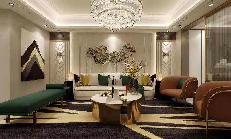 沙发背景和电视背景互信呼应用硬包温馨沙发线条增加层次。灯光点亮材质。