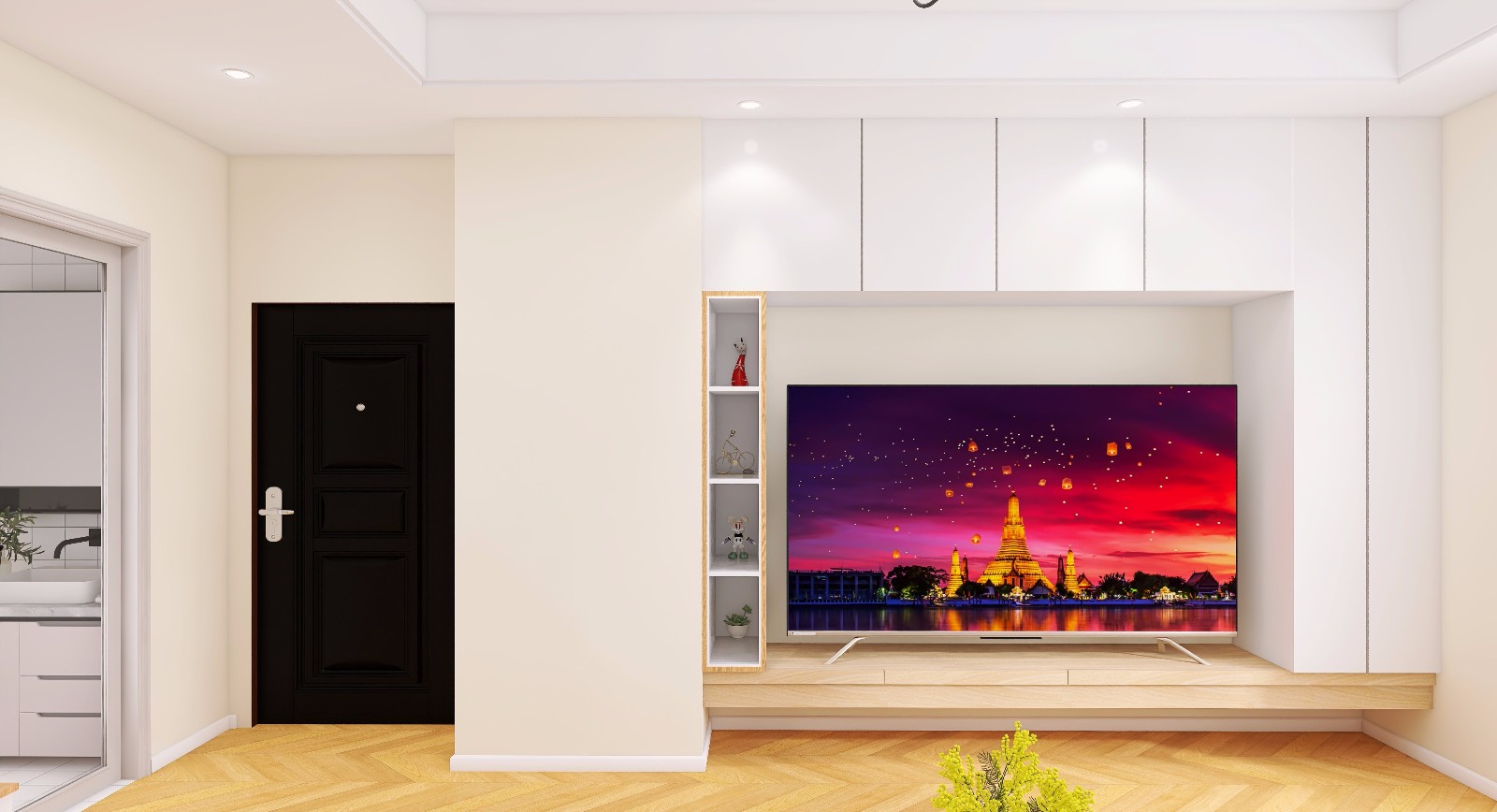 电视采用86寸电视,满足看电视也有储物的功能,左边开放阁工艺品区,提升视觉感受,