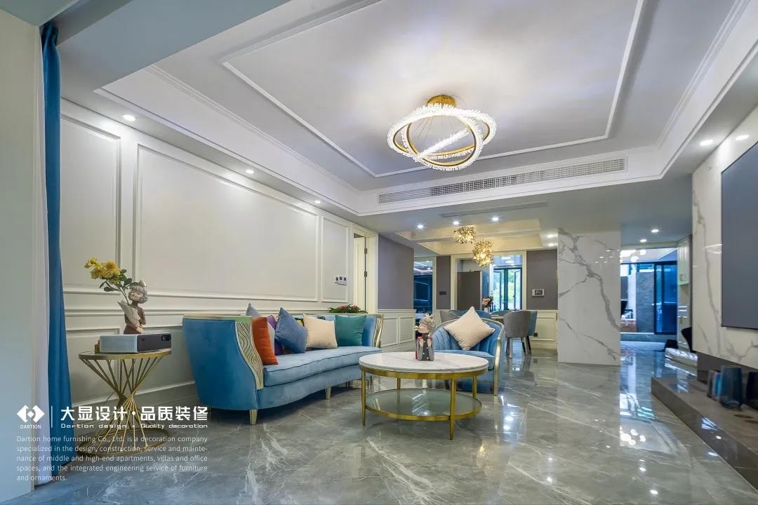 步入客厅空间,蓝色的天鹅绒沙发围合布局,聚焦于家人间的互动,搭配黄铜圆边茶几和灰蓝双色窗帘,透露出高贵、优雅的气质,中和了大理石地面的冰冷感。