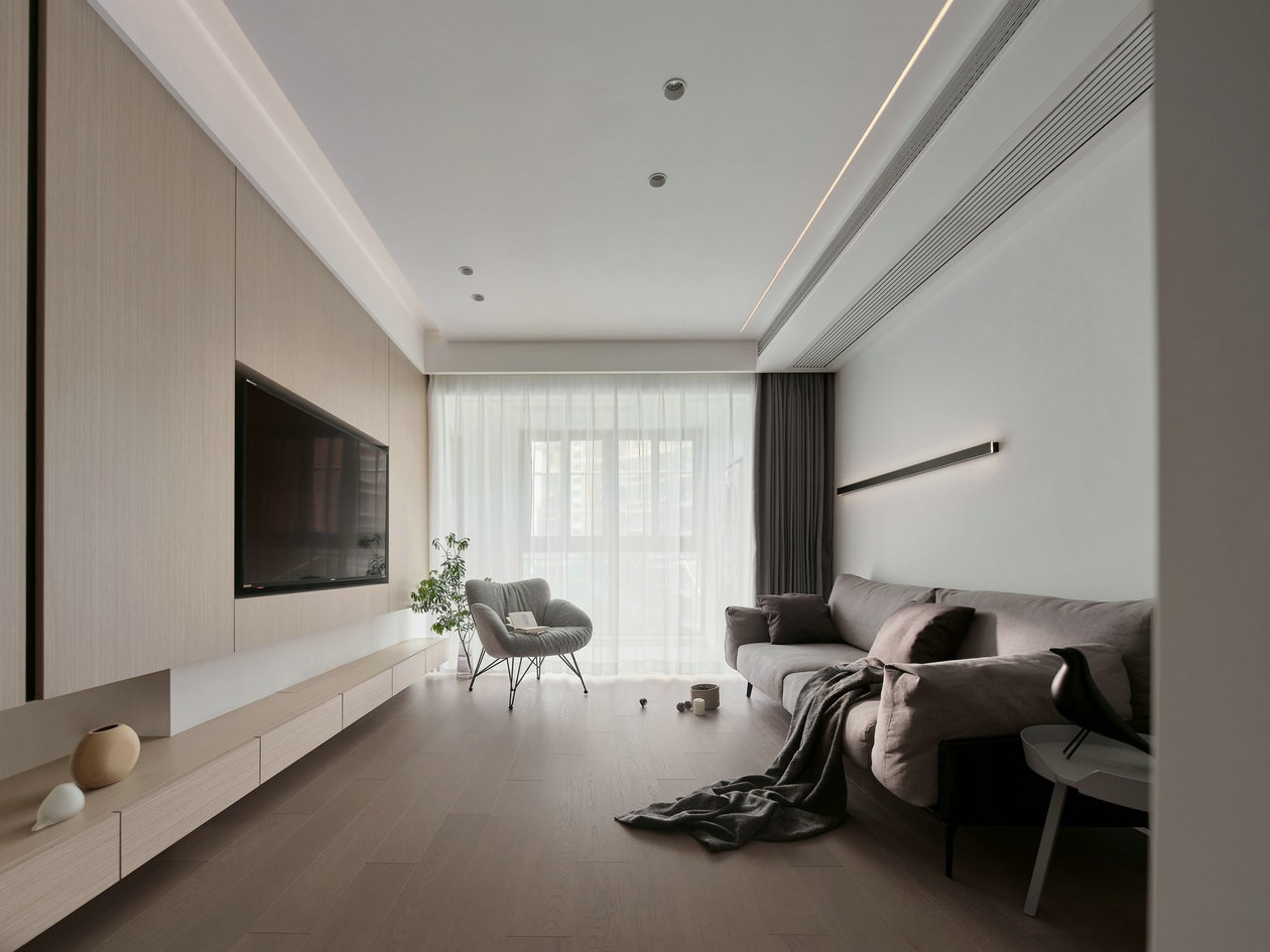 主卧床头背景墙利用石膏板抽缝工艺,节简又有层次感。悬空床头柜将墙裙和衣柜交错呼应,形成连贯的空间体。