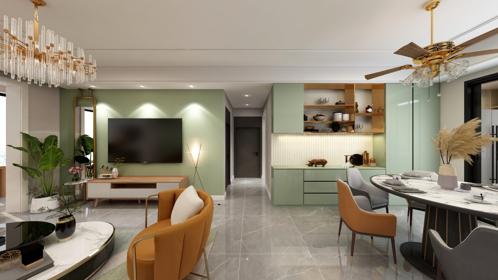 从玄关进来是客餐厅,首先看客厅,在玄关区域延伸过来的绿色乳胶漆承担了客厅墙面装饰的任务,它的出现让客厅的色彩不再单调。