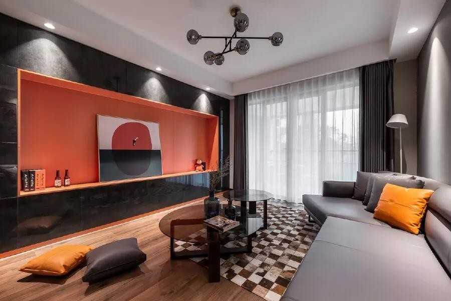 全案设计师陈航选用 爱马仕橙作为电视墙的主题色 除了欢快活泼更增添了些高贵与华丽 搭配原木地板的温润质感 既有着年轻自信的活力 又有着安抚人心的魅力