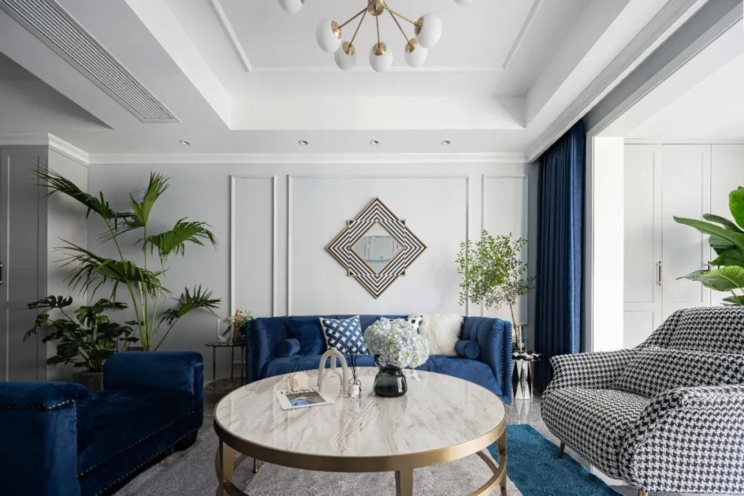客厅,湛蓝色的丝绒沙发搭配千鸟格单椅。