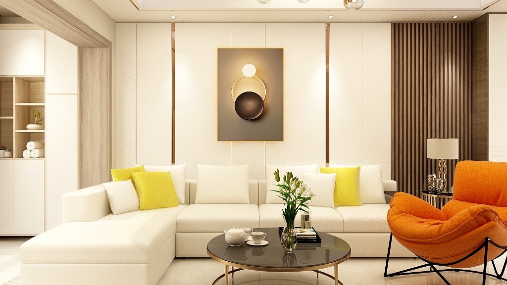 整体以现代简约风格为主,简单大气,背景墙硬包,加入金属线条,呈现出轻奢风的质感。