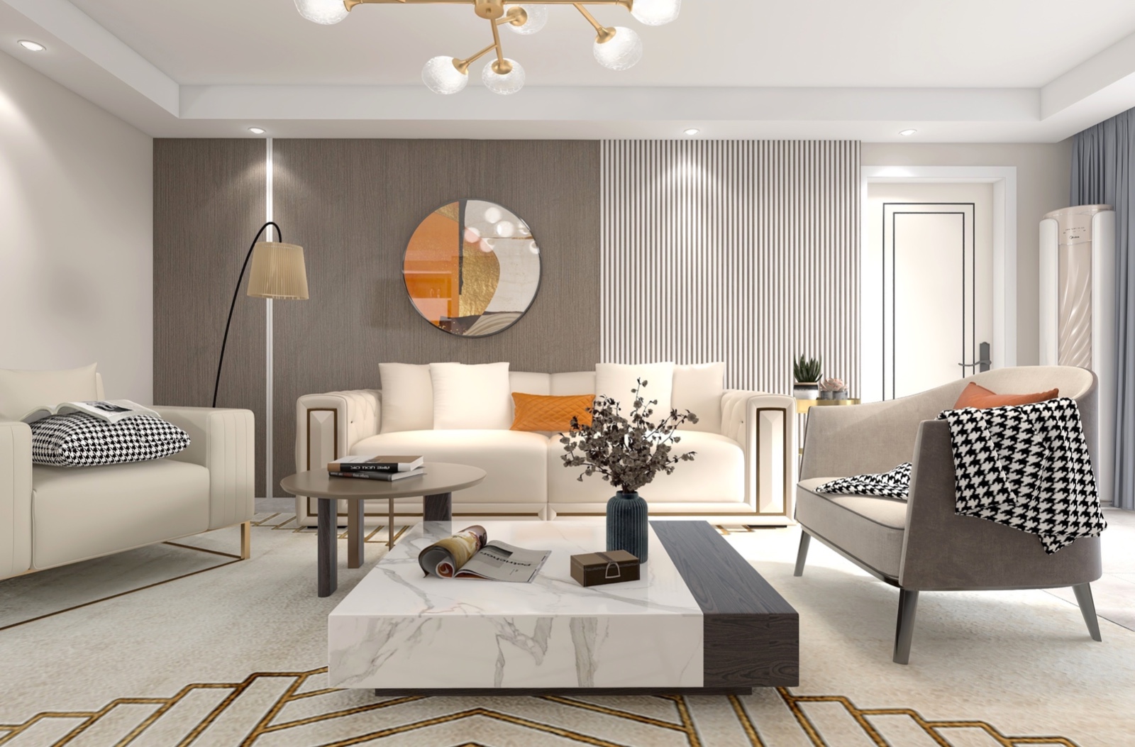 客厅采用的是暖白色调为主,白色沙发的搭配与调色单人位恰到好处。