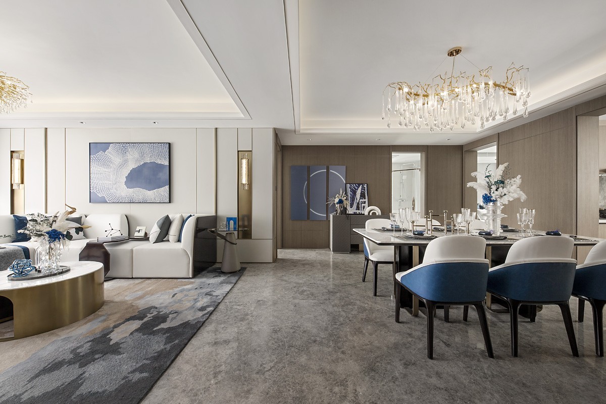 蓝与光共舞 光影的变化, 为客厅赋予了一种时间感。 设计选材上大理石岩板通透, 肌理墙布亲肤,皮质家具造型优雅, 理性与浪漫、古典与现代 在无形中达至微妙的平衡。 身处其间,蓝色与光影, 营造出动人且富有层次的体验。