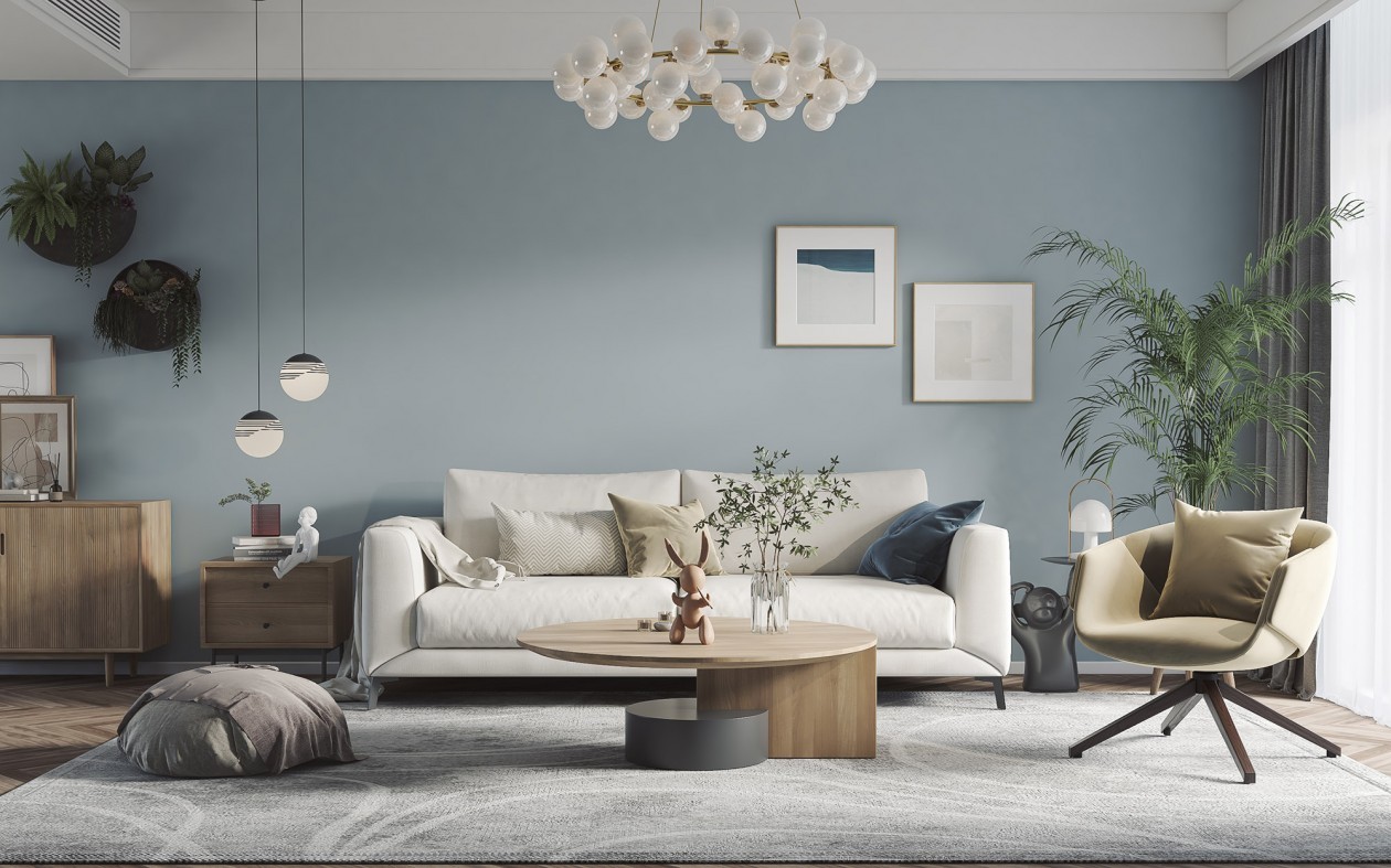 整体空间以浅蓝为基调,搭配白色皮质的沙发,使整个空间显得温暖又时尚。简洁利落的框架结构结构调和了大面积色块带来的限制感,使空间显得轻盈又不失质感,层次分明。