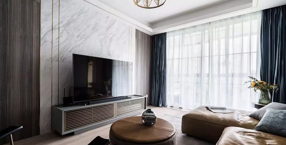 客厅,灰蓝色的电视柜,木栅格的条纹,在白色大理石与木饰面的色块背景下,产生清爽轻盈的视觉体验。