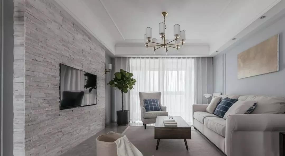 客厅,低明度色彩提升空间格调,辅以大大的落地窗以及轻盈的纱帘,呈现出一种简约优雅的气质。