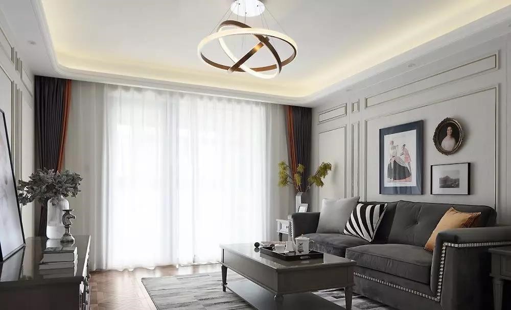 客厅,阳光透过纱帘洒在宁静的屋内,营造温暖舒适的空间氛围,金色圆环吊灯在视觉上营造出了优雅与灵动的感觉。