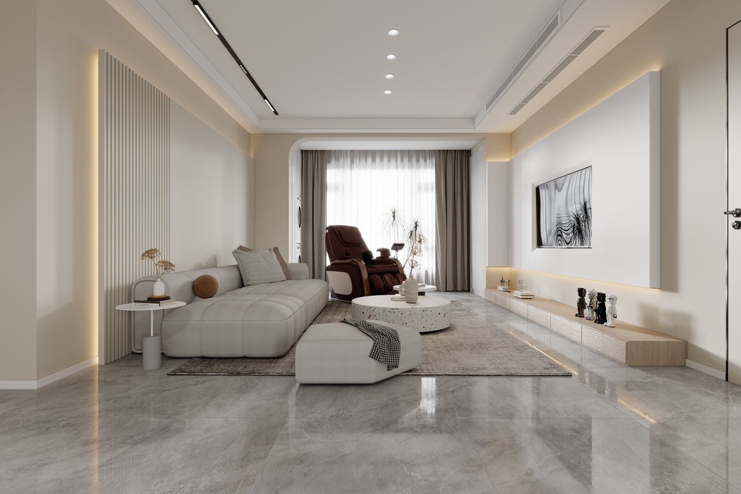 客厅色调上我们保持米色调,同时我们仅用一些暖色灯光作为点缀即可。 在客厅设计上利用背景墙先内嵌出电视位置,背景墙与地台中间留出位置,通过内藏灯带渲染整体氛围。沙发背景墙采用木饰面格栅点缀与米白色乳胶漆的结合,整体空间造型简约利落。
