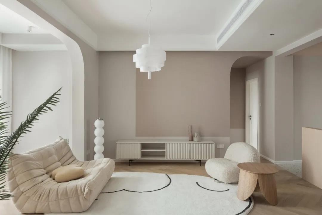 客厅橡木地板以人字拼贴法落地,墙面上选择反差小、饱和度低的乳胶漆,打造温馨轻奢的主基调,花瓣可随处摆放,美观的同时保证一定的置物功能。