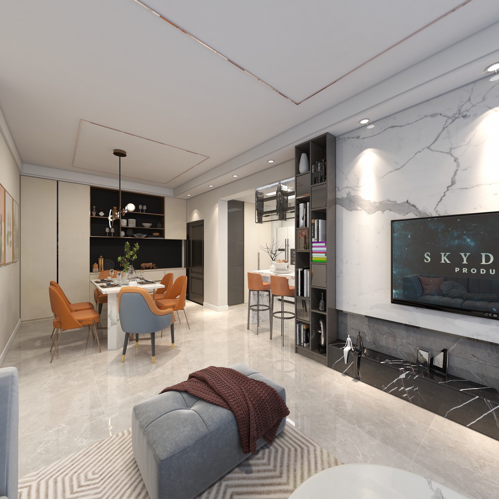 简约的设计,用橘色突出设计,温暖的效果一触即发,开放式厨房,加上休闲的小吧台在下班的时候轻轻的轻酌