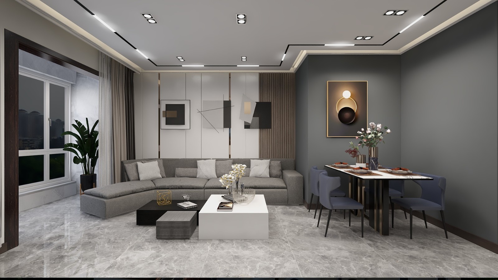 全屋采用无主灯设计,餐厅背景使用深色处理,扩大空间视觉。