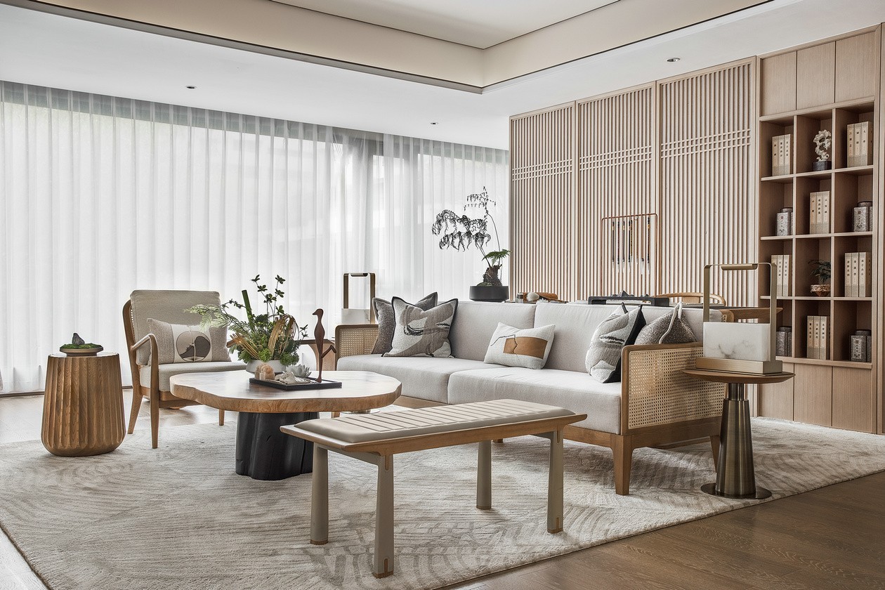 客厅整体空间剔除复杂装饰回归淳朴,以自然肌理为主色调,将温婉优雅、精致极简暗藏于内,将平静内敛呈现在眼前。