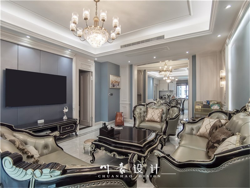 客厅整个空间以高档壁纸为基础,墙面再以白色木饰面做装饰,营造了一种放松而又开阔的空间感。欧式沙发、边几,精细的雕刻,舒适的质感,彰显优雅高贵气质。