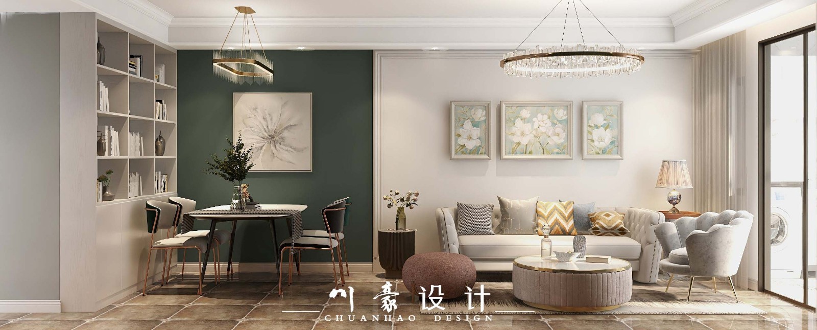 整个空间的设计以墨绿色作点缀,沉稳而又不失***感。金属元素融入到整个空间中,将轻奢的感觉表现出来。空间的布局上更注重互动性,围合式的客厅布局、开放式的客餐厅,都能增进彼此之间感情的交流。