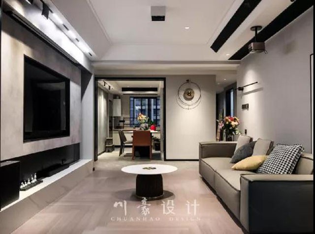筒灯、射灯、线性灯等无主灯设计,打造更有层次感的灯光效果。将电视嵌入墙体,保持了电视背景墙的完整性,更显美观,同时考虑到家有孩子,增加投影幕布设计,可以减少电子产品对孩子眼睛的伤害。