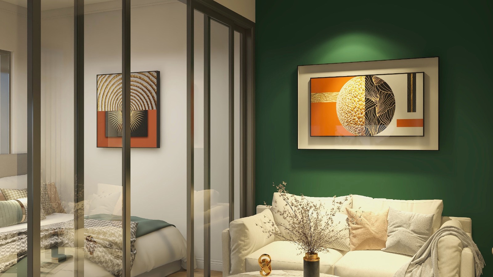 为满足客户的需求,将综合厅空间化分为两个空间,及可以休息又可会客;中间采用推拉式玻璃隔墙及化分了空间同时会客厅也不会显视暗;