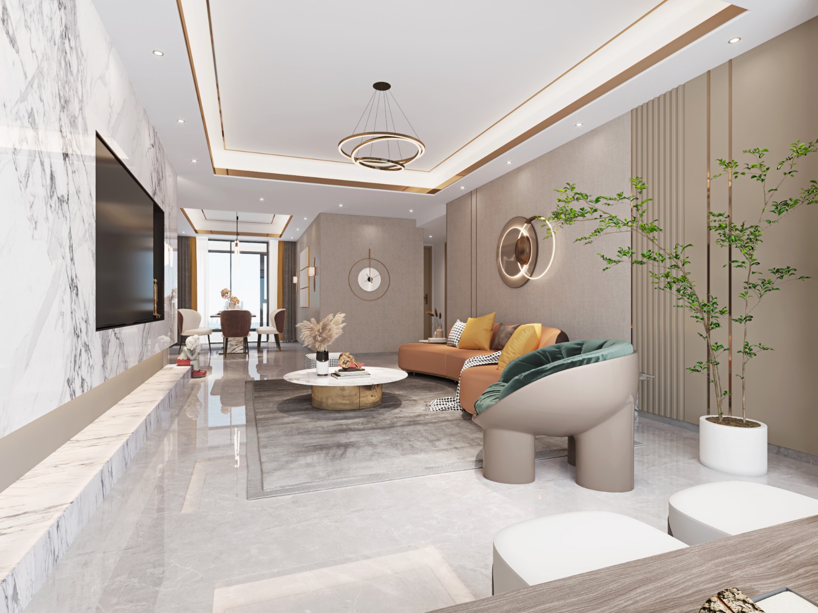 在硬装上,大理石的电视墙与地板将客厅衬托得通透又明亮,金属边框将空间的美感勾勒出来,线条的强调带来更加流畅的空间感;而软装中,沙发与茶几选择了线条圆润流畅的圆弧形,温暖的橘色让客厅更添一分柔和,既拥有帅气利落的现代感,又不减少属于家的温馨。