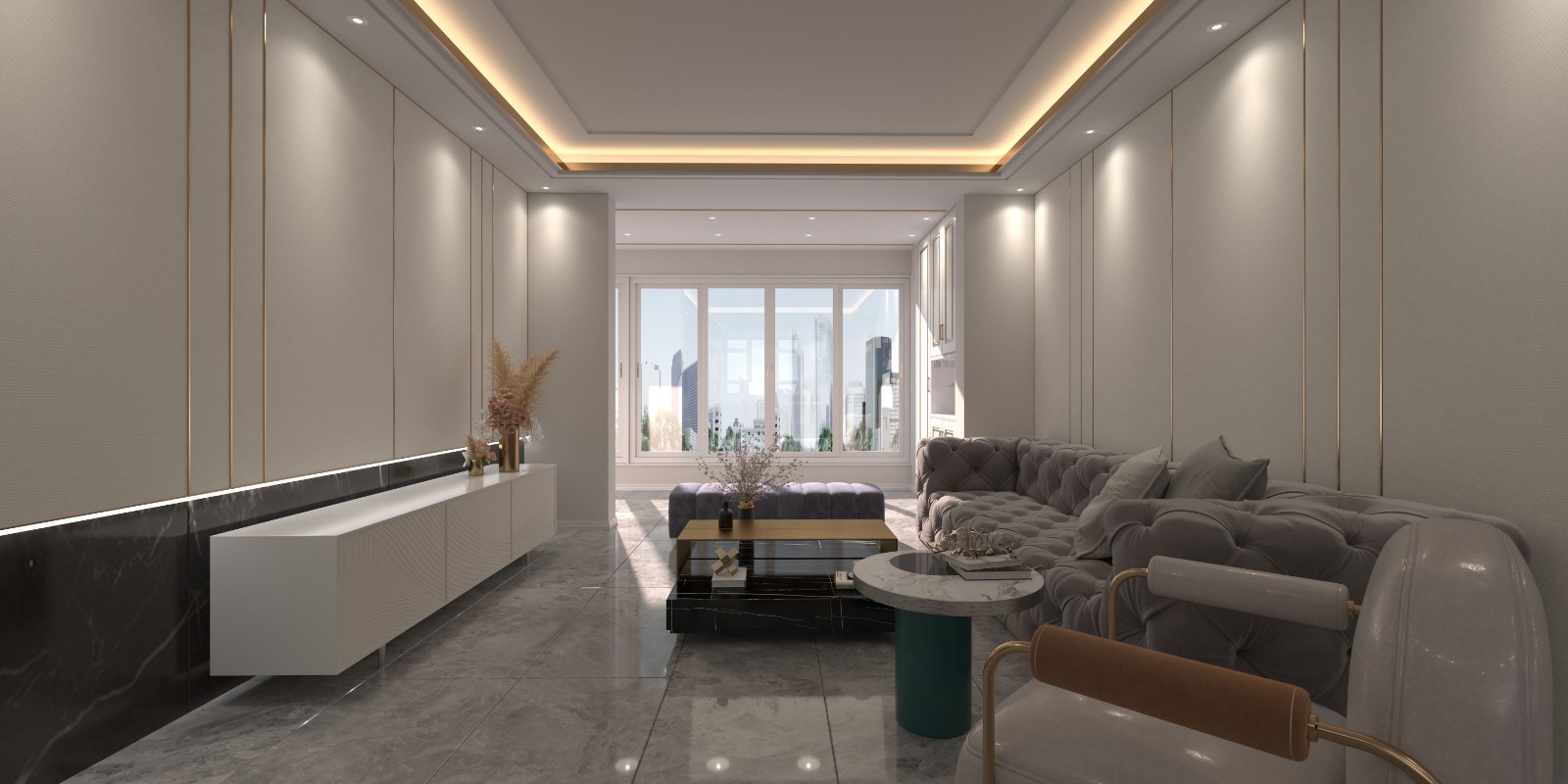 我们在空间设计中材质上我们采用了简约的大理石材去处理,柜体加了灯带让空间更有温度。