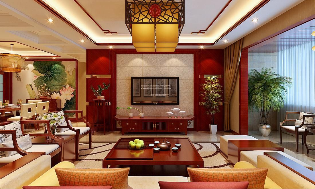 新中式的风格 加上木纹大灯 深木色背景墙 深色茶几 有种浓浓的复古感