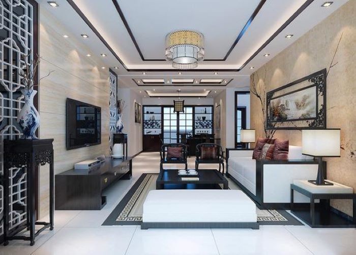 中式小家独特的深木色家具 配上客厅后墙上挂的壁画 搭配层次吊顶 前后木色壁纸 很有温馨味道